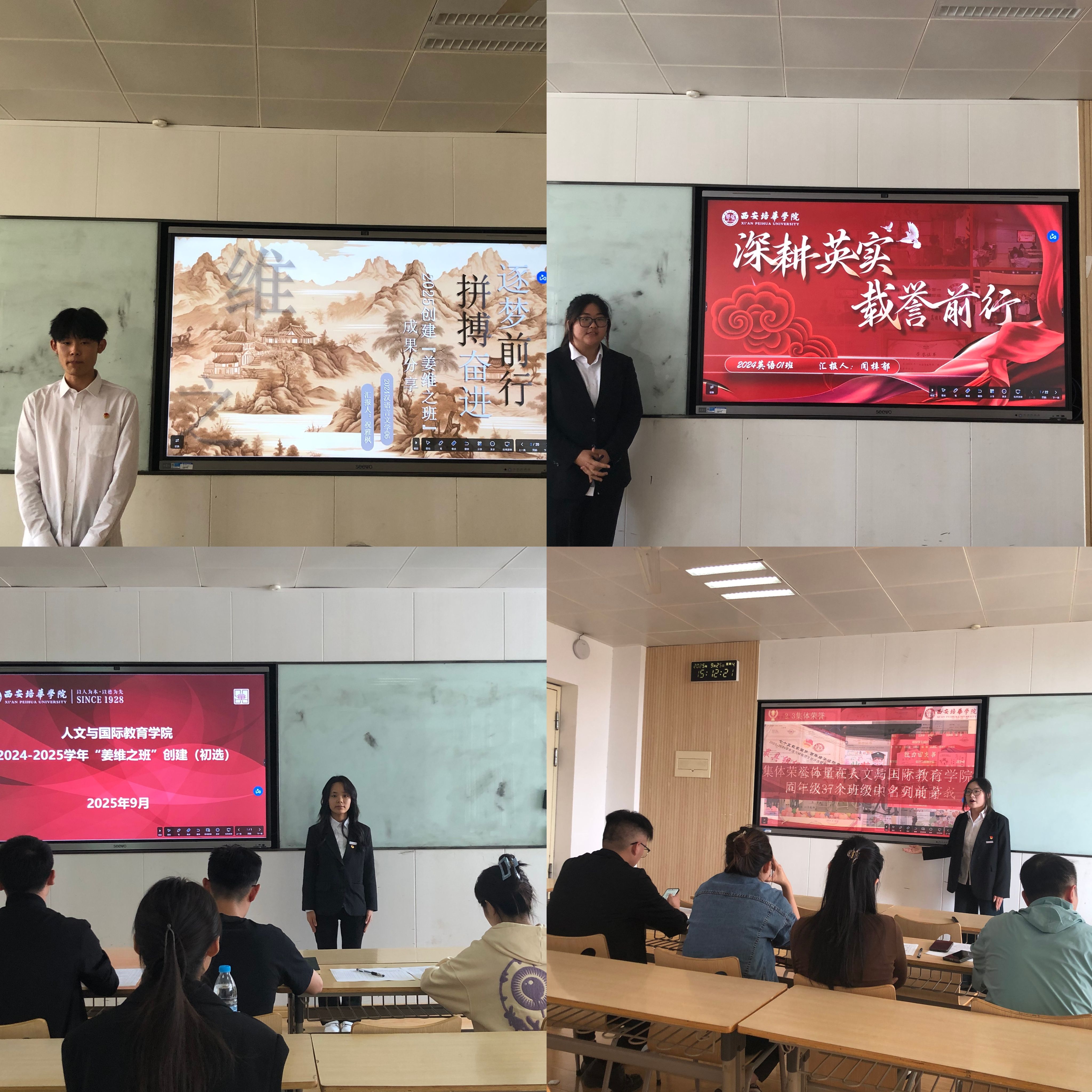 为深入推进班级文化建设,弘扬“姜维之精神”,2024-2025学年人文与国际教育学院“姜维之班”创建初选评审会于9月25日下午在格物楼顺利开展。本次初选分为三个小组同步进行,共有24个班级参与汇报展示,学院党委书记、副院长南兵,党委副书记王伟平、团委书记、学生干事及辅导员代表担任评委,现场氛围庄重而热烈。