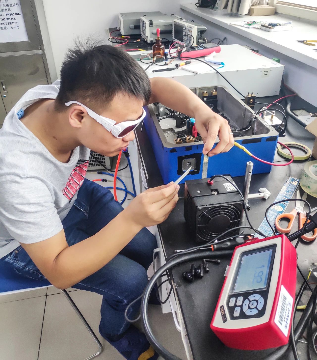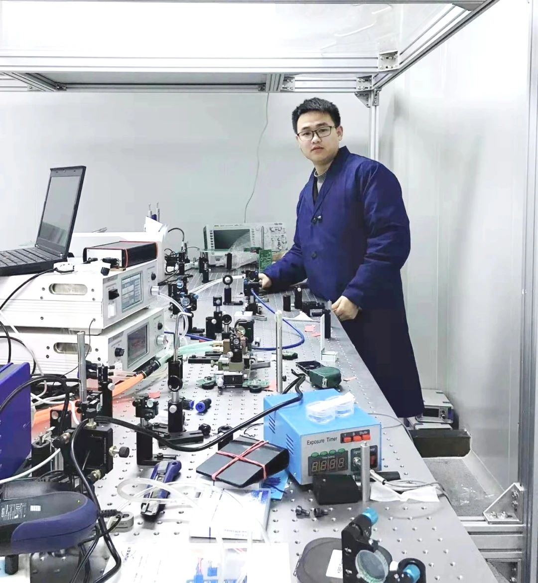 面对肉眼不可见的泵浦源波长、复杂的参数匹配以及无数次失败与重来的挑战,袁振没有退缩。这份坚持与执着,终于在2022年3月的一个深夜得到了回报。那一刻,振荡器的非线性晶体中绽放出了蓝紫色的荧光,如同夜空中最亮的星,照亮了袁振疲惫的脸庞。他迅速检查感光卡,确认光斑的出现,那一刻的喜悦与激动难以言表,他知道,自己离成功又近了一步。
