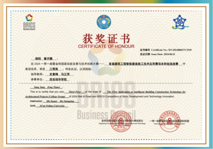 智能科学与工程学院在本次金砖大赛建筑赛项中贯彻落实习近平总书记关于“激励更多劳动者特别是青年一代走技能成才、技能报国之路”的重要指示,和金砖国家领导人关于加强金砖国家间技能、加强标准化领域交流与合作等有关精神,不仅高度聚焦党的二十大“推进工业、建筑、交通等领域清洁低碳转型”精神,对接国家“十四五”规划“发展智能建造、推广绿色建材、建设低碳城市”要求,而且积极响应绿色低碳创新型竞赛设计思路、数字化竞赛平台,大力推动土木工程专业学生进行施工类行业相关岗位的知识、技能、素养训练。最终我校土木工程专业学生王博洋、刘小川(指导老师刘清颖、史素梅)获得区域团体三等奖一项,土木工程专业学生杨阳、曾天赐(指导老师史素梅、马江萍)获得区域团体三等奖一项,土木工程专业学生杨阳、曾天赐(指导老师史素梅、马江萍)获得全国团体优秀奖1项。