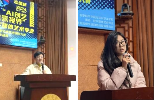 传媒与设计学院常务副院长徐莹在致辞中表示,大赛体现了人工智能对艺术创作方式和理念的深远影响,鼓励学生们继续在创作与技术应用的道路上探索前行。陕西泓儒文盛网络科技有限公司人力资源官吴宇芮对参赛学生的卓越表现给予肯定,并期待与学院开展更深入的合作。