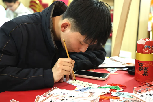 “笔底生花书法集市”上,同学们挥毫泼墨,写下了一副副寓意吉祥的对联,墨香四溢,让人感受到了传统文化的魅力。