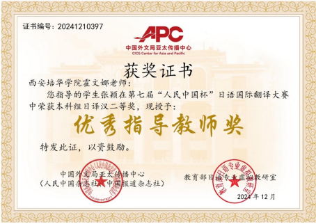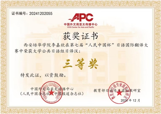 培华学子在此次大赛中的优异表现,不仅展现了学生的才华和努力,也体现了西安培华学院在日语教育和翻译人才培养方面的卓越成果。学校一直致力于为学生提供优质的教育资源和广阔的发展平台,未来将继续坚持以赛促学、以赛促教,为学生提供更多丰富的学习和实践机会,不断提升学生的综合素质和竞争力,为社会培养更多优秀的翻译人才,为推动中外文化交流贡献力量。
