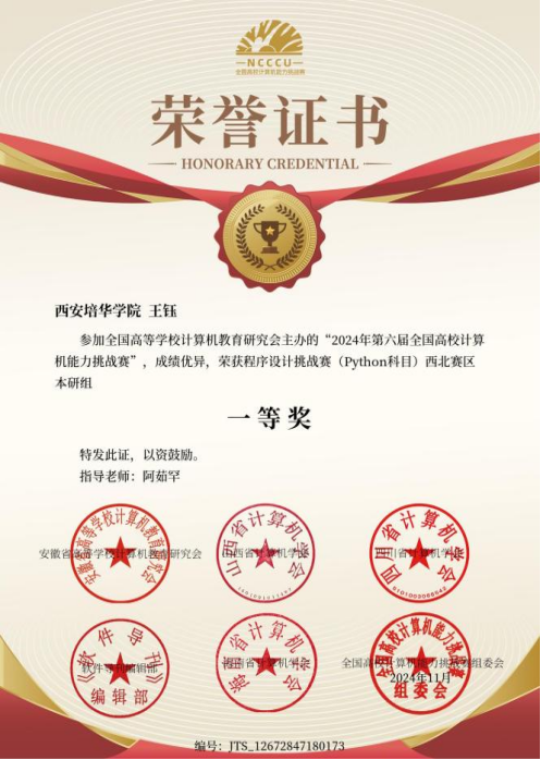 近日,会计与金融学院2022级财务管理01班的王钰同学在全国高等学校计算机教育研究会主办的“2024年第六届全国高校计算机能力挑战赛”中斩获一等奖。这一荣誉的获得,不仅是对王钰同学个人努力的肯定,也是会计与金融学院在培养“懂业务、懂技术”复合型人才方面取得的显著成果。
