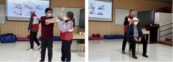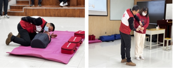 在培训过程中,授课老师结合生动鲜活的实际案例,围绕心搏骤停的识别方法、徒手心肺复苏(CPR)的操作流程、海姆立克急救法的规范操作、自动体外除颤仪(AED)的正确使用、创伤现场急救技术等内容进行讲解,他把理论知识和实际操作相结合,利用模拟人、包扎盒、AED等各类教具进行现场示范,让抽象的知识变得直观可感。