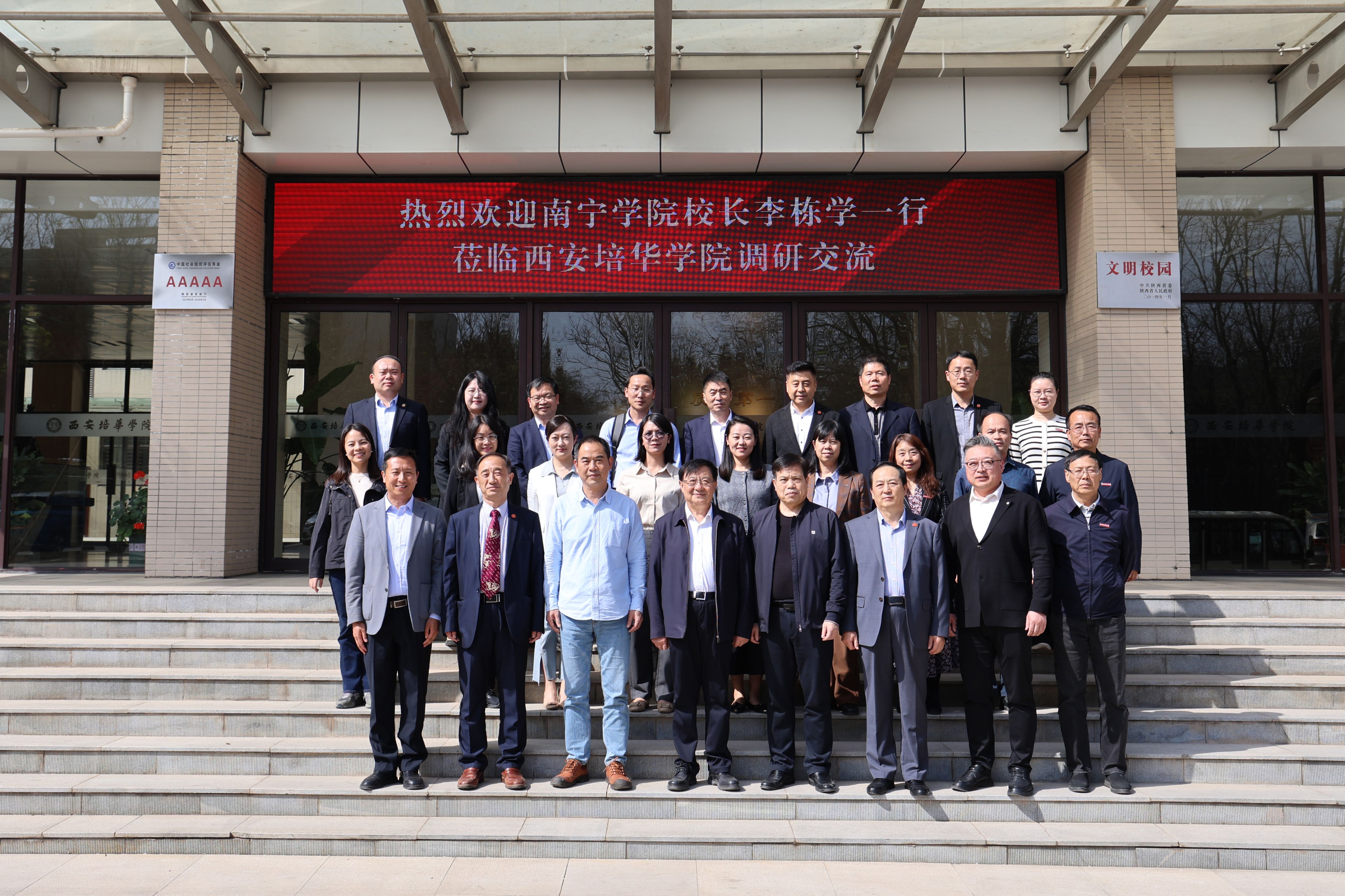 4月7日,南宁学院校长李栋学一行12人来我校开展调研交流活动。此次调研旨在深化两校在人才培养、学术研究、国际交流等领域的合作,进一步落实应用型高校“不孤”联盟的共建目标,推动双方内涵式高质量发展。