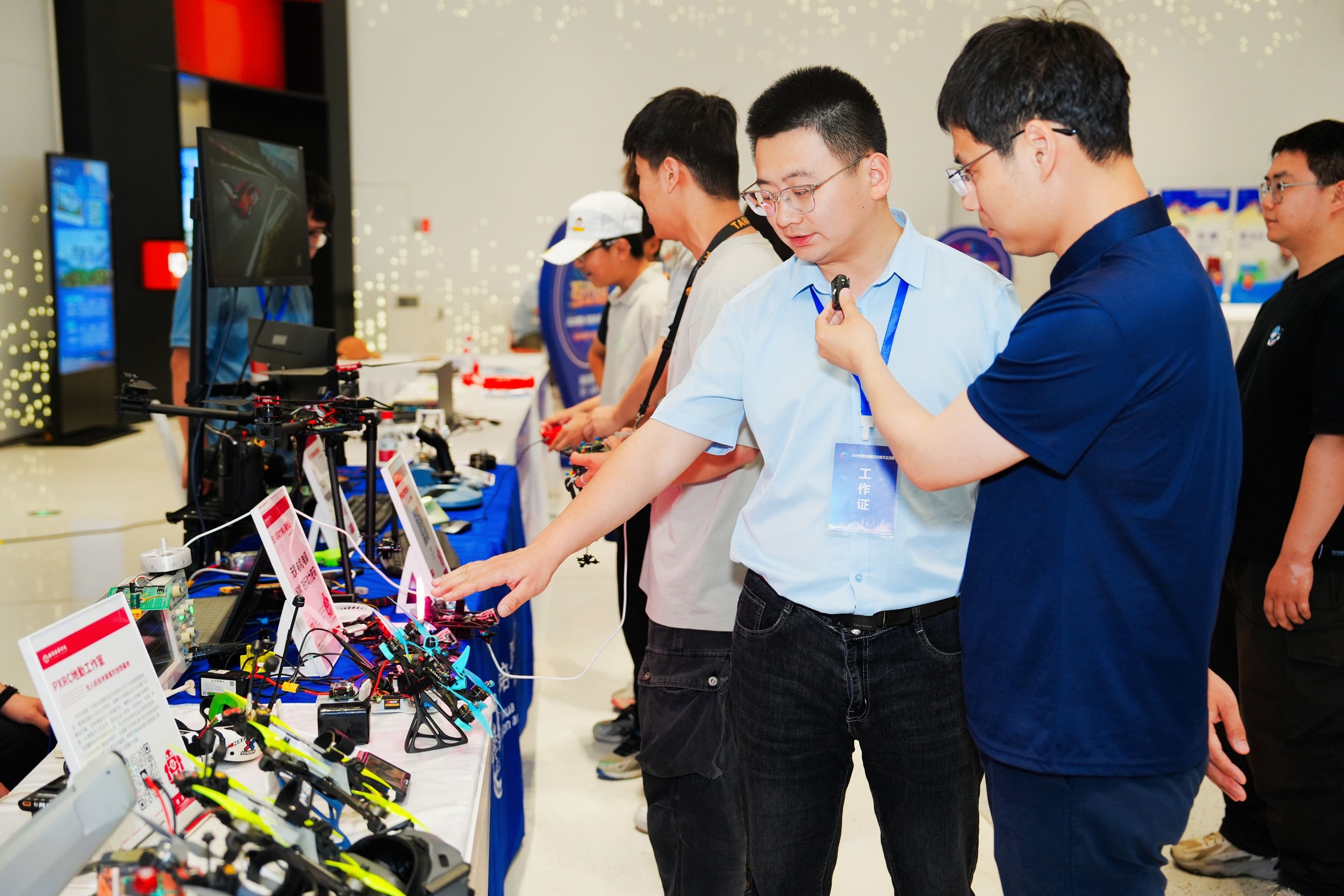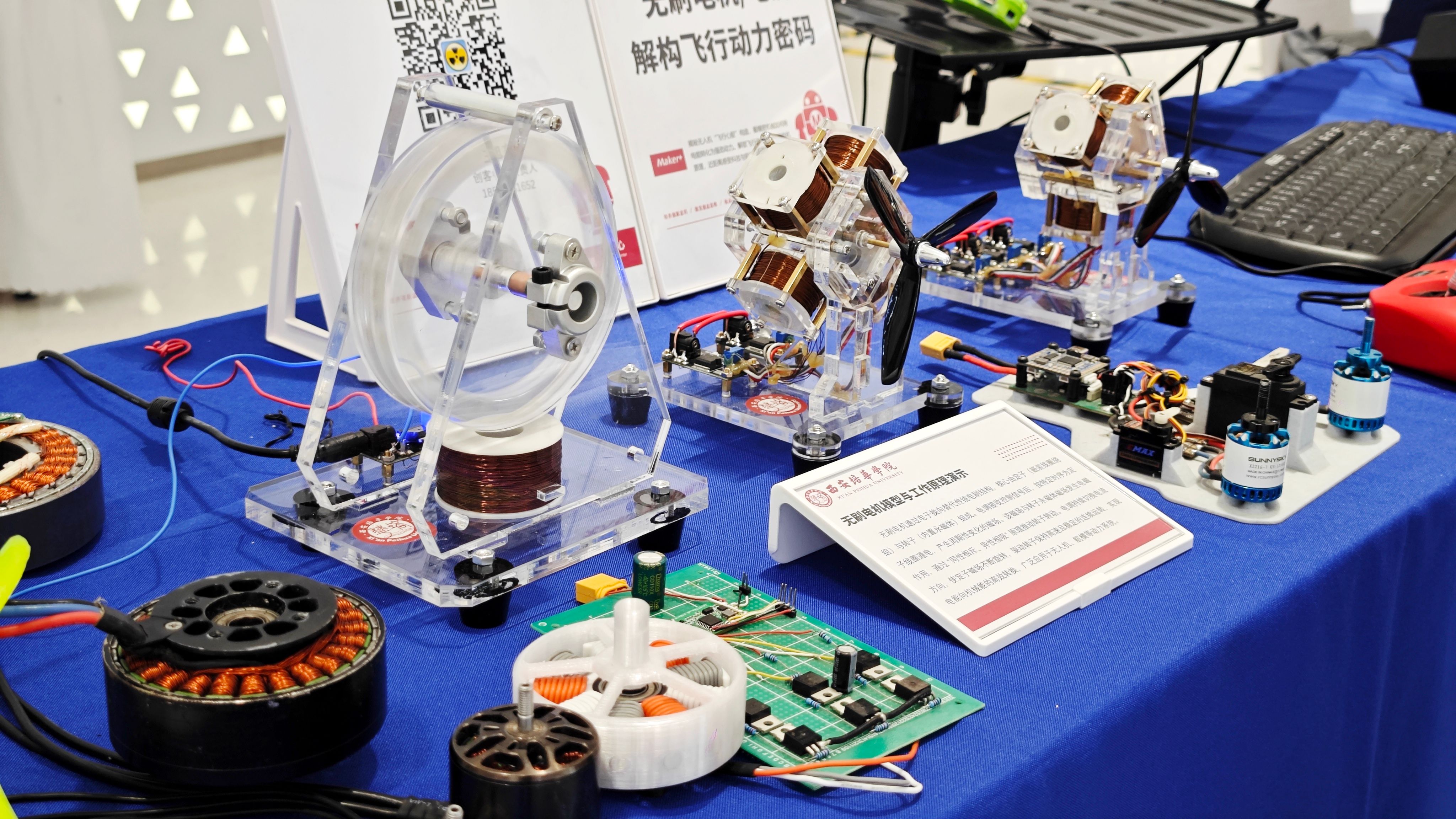 活动现场,学校展位集中呈现了创客中心孵化团队自主研制生产的无人机成品、无人机动力核心部件无刷电机的工作原理演示模型及模拟飞行体验项目。