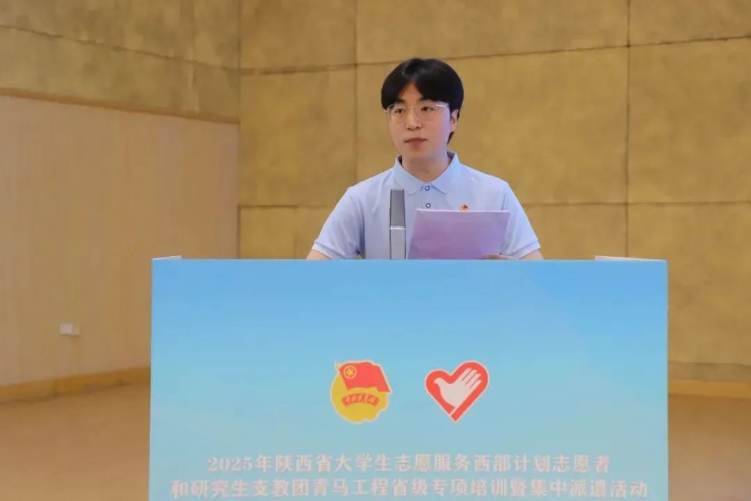 出征仪式上,与会领导为2025年新招募在陕服务西部计划志愿者赠送出征装备,为2025年陕西省大学生志愿服务西部计划陕西服务总队和各服务分队授旗,全体西部计划志愿者庄严宣誓,集体发出了“清澈的爱,只为中国”的青春誓言。
