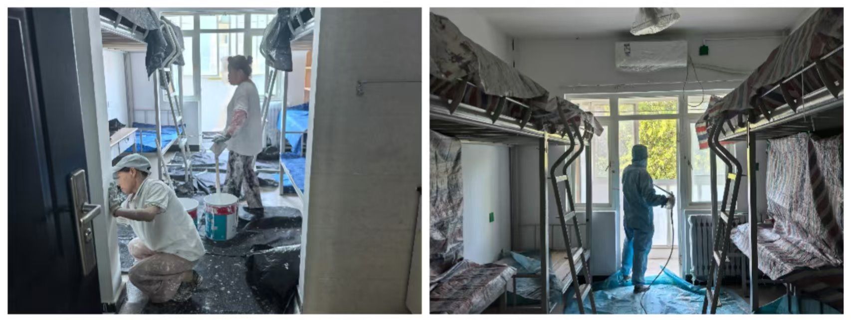 教学楼区域主要完成科创中心内部装修、外围附属设施建设;更新育英楼、汇知楼公共区域设施设备及吊顶;加装明德楼暖气总阀门等工作,让教学环境更舒适、功能更完善,实现“颜值”与“实用”双提升。学生公寓区域主要完成1500余间毕业生宿舍全面改造,对脱落墙皮进行彻底清理,重新粉刷墙乳胶漆等工作,为学生打造更温馨、更舒适的居住空间。
