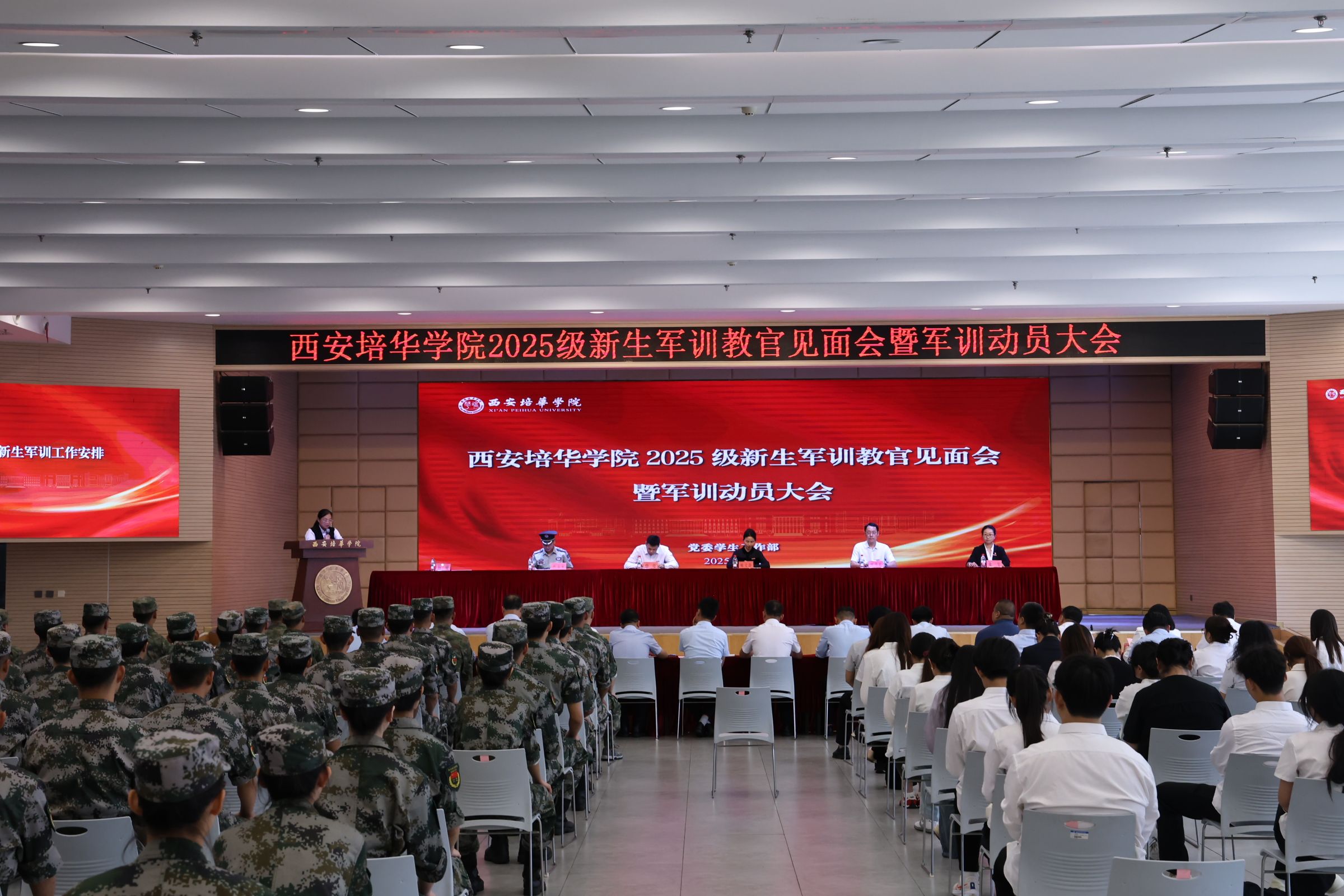 9月1日上午,西安培华学院2025级新生国防教育动员暨教官见面会在恒友楼多功能厅顺利举行。校党委副书记、副校长姚文静、党委副书记蔡亮出席会议,党委学工部部长权勇太、军训团团长严保利、党委学工部副部长杨媛、校团委书记董莹,各二级学院党委(党总支)书记(副书记)、全体新生辅导员及2025级全体新生军训教官们参加本次见面会。大会由党委学工部朱林鹏老师主持。