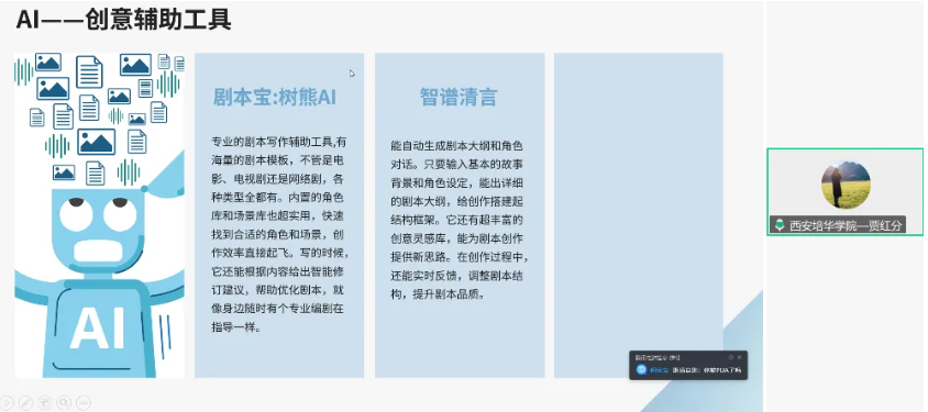 作为西安培华学院首批AI赋能教学改革课程优秀项目负责人,贾红分老师围绕“AI赋能”模块作题为《AI赋能剧本创作:编剧与AI的协作之旅》的专题报告。她强调,AI是编剧的协作工具而非替代者,并系统演示了剧本宝、智谱清言、搭画快写等AI平台的功能应用——从选题、梗概、大纲、人物小传到分集剧本的生成流程,均需分步骤操作且“不能一次生成全本”。以“自恋型人格”角色创作为例,她通过对比不同提示词效果,揭示精准提示对提升AI输出质量的关键作用。此外,她还推荐了DeepSeek、KIMI等AI备课工具及课件帮、有言、剪映等数字人微课制作工具,助力教师高效备课。