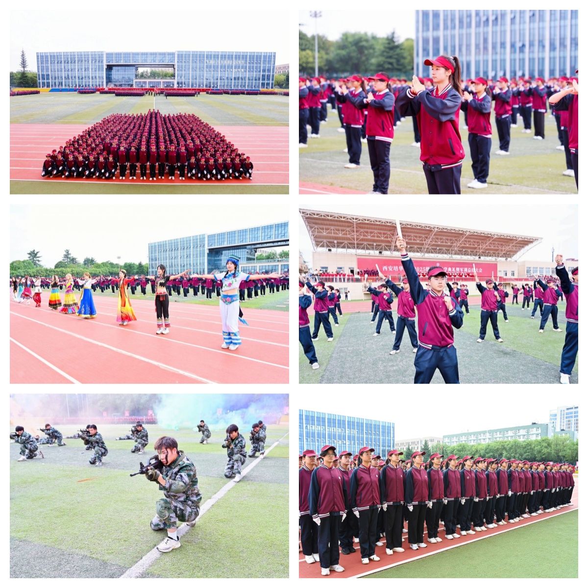 2025级新生以丰硕的军事训练成果交出青春答卷。汇报表演成为全场焦点:红歌朗诵队以铿锵之声穿越百年风华,“没有共产党就没有新中国”“团结就是力量”“少年强,则中国强”的誓言,字字句句皆是培华学子对家国的深情告白;擒敌拳方队拳出如风,刚劲有力,一招一式尽显军人风骨;花样舞蹈队踏着《美丽中国》的旋律,以灵动舞姿勾勒山河锦绣,56个民族裙摆飞扬,尽显青春蓬勃朝气;队列方阵以“百年培华”等字样定格绿茵场,铭记七迁校址、九易其名的奋斗历程;警棍术方队以棍为刃、以身为刃,展现极强的战术配合与制敌能力;战术方队模拟实战场景,持枪突进、掩体射击,战术动作专业流畅,将“能打胜仗”的信念刻入青春肌理。