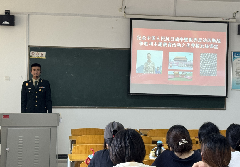 为纪念中国人民抗日战争暨世界反法西斯战争胜利80周年,传承红色基因、培育爱国情怀,9月15日,马克思主义学院习近平新时代中国特色社会主义思想教研室举办了一场别开生面的“优秀校友进课堂”活动。曾参与九三阅兵的我校优秀校友胡宗祥重返母校,以“阅兵亲历者”的身份为汉语言文学2401班和数字媒体艺术2401、2402班的同学们带来了一堂生动的阅兵时政教育课。