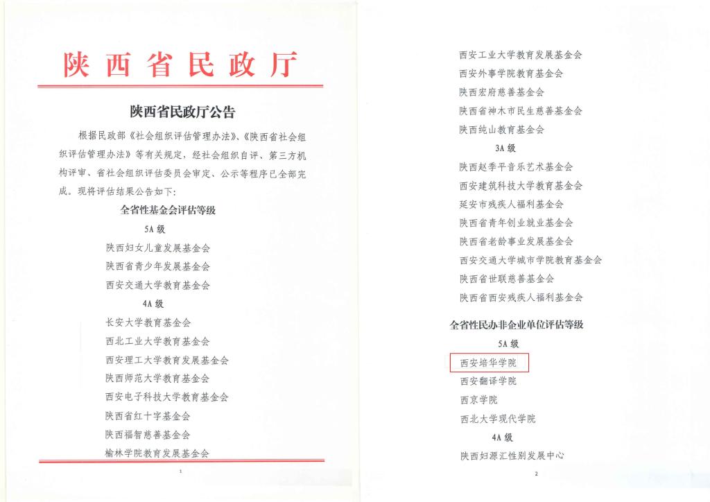 近日,陕西省民政厅公布了“全省性社会组织等级评估公告”,西安培华学院荣膺“5A级社会组织”称号。