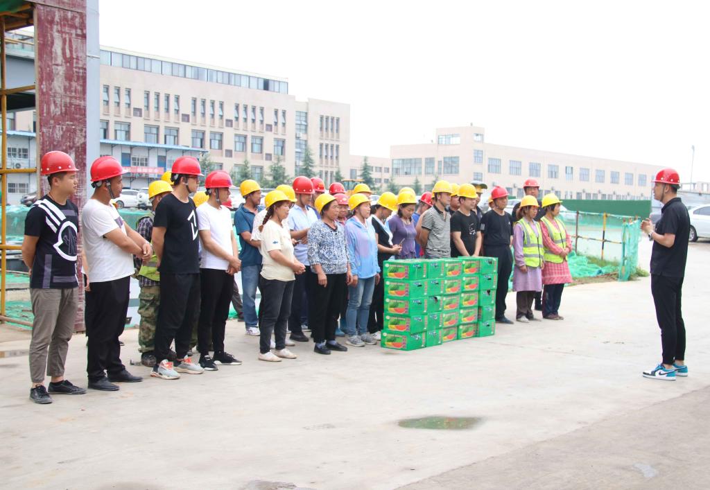 校长助理姜涛将400余斤西瓜等降温物资,送到了奋战在高温一线的基建人员手中,向他们表达祝福和感谢,并叮嘱工人时刻牢记高温季节施工安全注意事项,防止安全事故和高温中暑事件发生,确保人身安全。