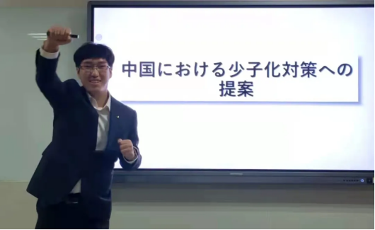 我校杨昕海同学演示形式新颖、内容简洁明了,围绕中国的结婚习俗习惯,对我国少子化提出解决建议。最终获得乙组冠军及赴日交流的机会。
