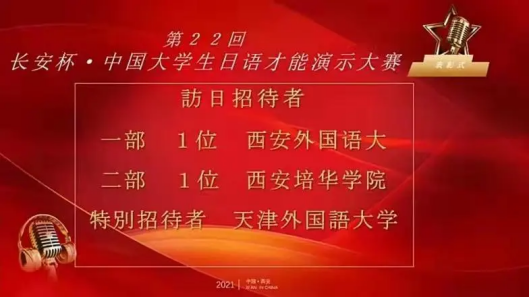 在10月30日举办的第22届“长安杯·中国大学生日语才能演示大赛”中,学校人文与国际教育学院外语系日语专业学生杨昕海凭借出色表现,荣获大赛乙组一等奖,西安培华学院荣获“最优秀学校奖”,我校日语专业教师小泽一博获得“优秀指导教师”。