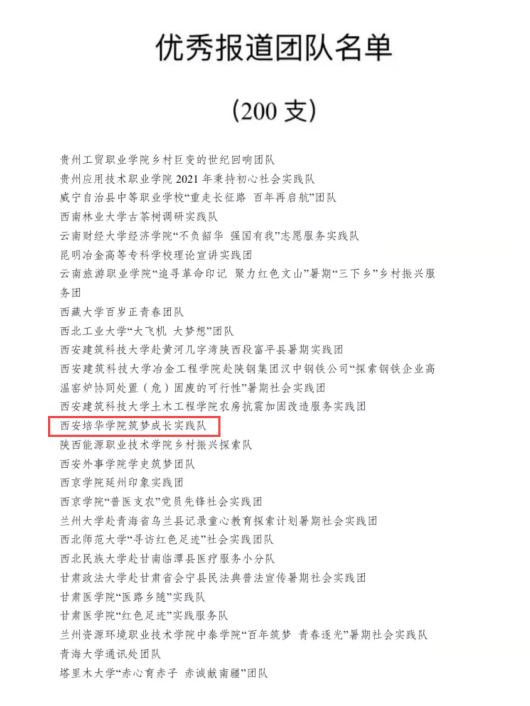 为充分宣传和展示2021年全国大中专学生志愿者暑期“三下乡”社会实践活动成果,团中央青年发展部、中国青年报、中国青年网共同举办2021年全国大中专学生志愿者暑期“三下乡”社会实践“镜头中的三下乡”成果遴选和“千校千项”成果遴选活动。其中,西安培华学院团委获2021年“镜头中的三下乡”优秀组织单位荣誉称号,学校筑梦成长实践队获“镜头中的三下乡”优秀报道团队荣誉称号,筑梦爱农小分队获“镜头下的三下乡”优秀视频团队荣誉称号,医学院青歌志愿服务队朱晓阳同学获“千校千项”社会实践先进个人荣誉称号。