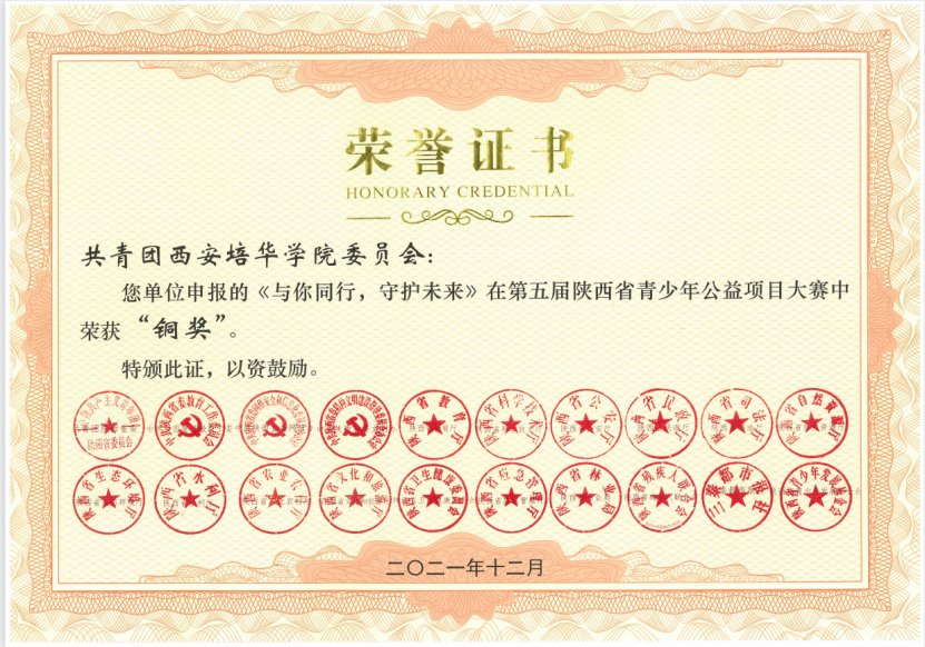 近日,第五届陕西省青少年公益项目大赛比赛结果揭晓。根据陕团联发《共青团陕西省委陕西省委教育工委 陕西省委网信办等关于第五届陕西省青少年公益项目大赛获奖情况的通报》,由学校推荐的《材优乡创——扎实培育学子,稳推“吴堡就业”》《以青春之名,陪你健康成长》荣获银奖,《博爱三秦,“救”在“益”起》《与你同行,守护未来》荣获铜奖,学校团委荣获本届大赛优秀组织奖。