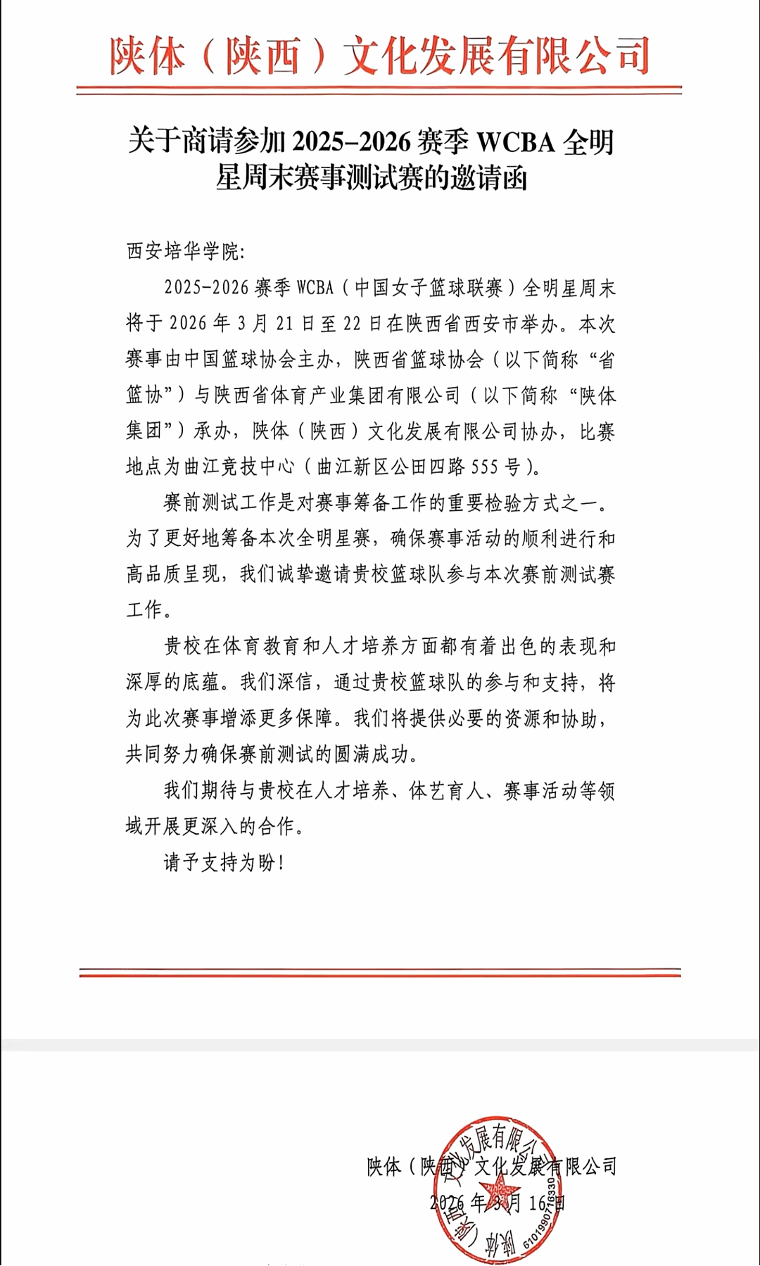 近日,西安培华学院篮球队收到陕体(陕西)文化发展有限公司邀请函,受邀参与2025–2026赛季WCBA全明星周末赛前测试赛。本次赛事由中国篮球协会主办,陕西省篮球协会与陕西省体育产业集团有限公司承办,于2026年3月21日至22日在西安曲江竞技中心举办。