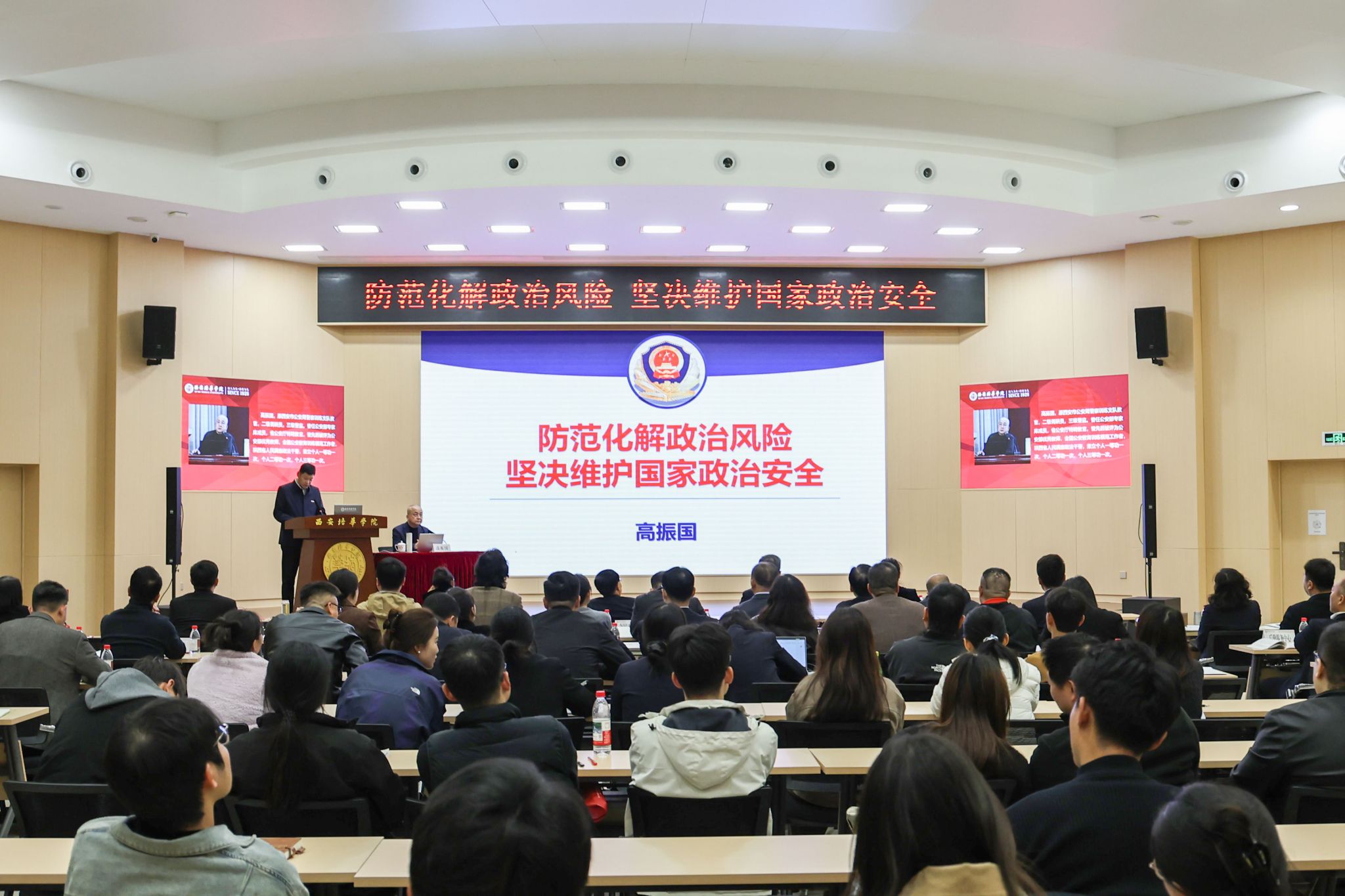 为深入贯彻落实总体国家安全观,切实提升师生国家安全意识与防范能力。3月25日下午,西安培华学院在明德楼学术报告厅举办“防范化解政治风险,坚决维护国家政治安全”主题报告会。学校全体在家校领导、二级学院院长、党委书记、职能部门负责人,教职工代表等200余人参加报告会。报告会由党委副书记蔡亮主持。