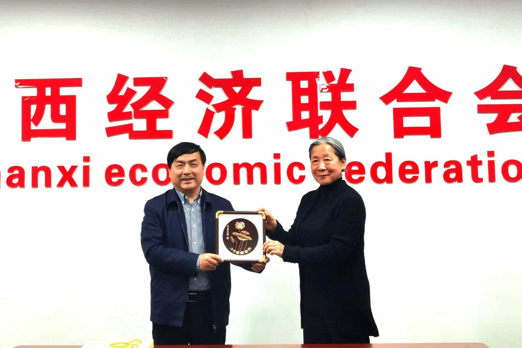 陕西经济联合会会长刘迎军向中国工业合作协会会长田玉萍赠送礼品