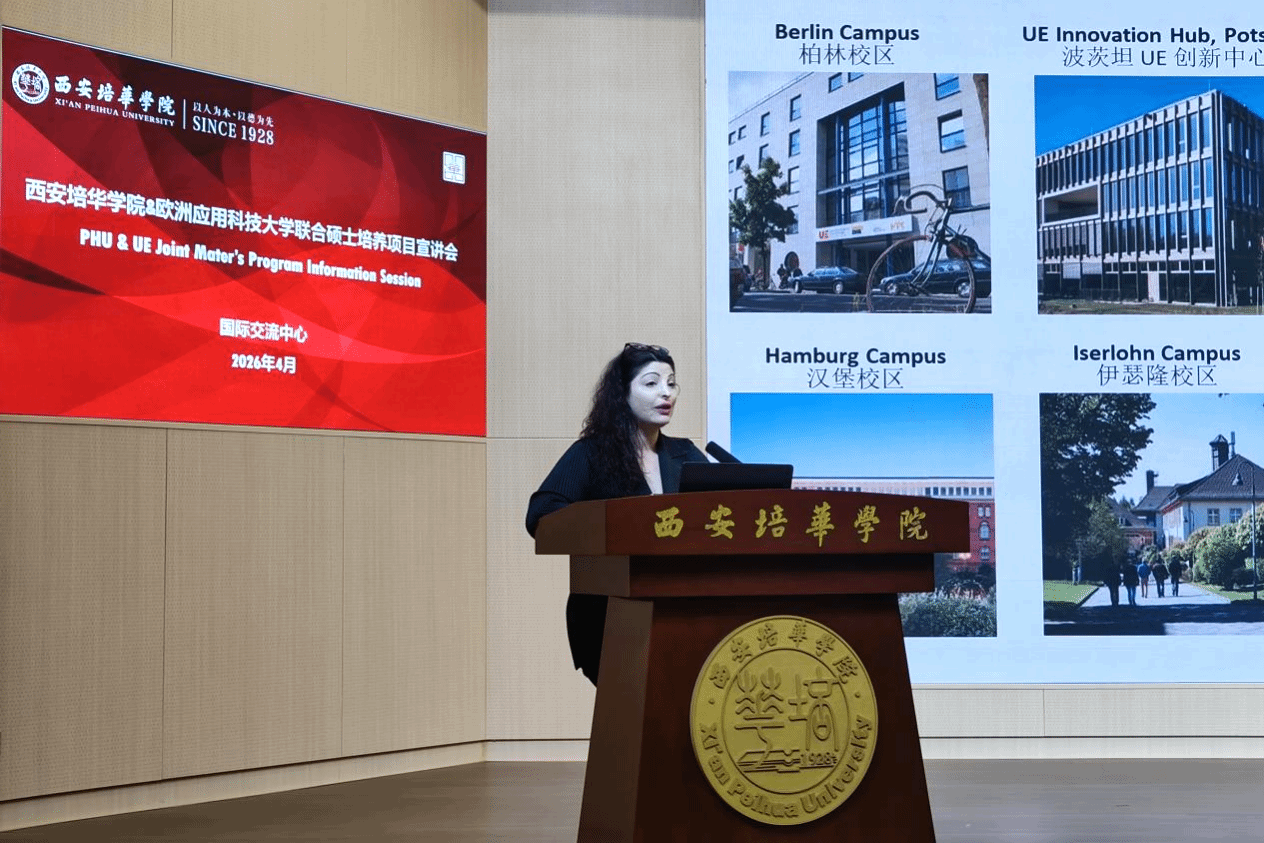 4月7日下午,德国欧洲应用科技大学(University of Europe for Applied Sciences,简称UE)副校长Jiré Emine Gözen教授到访西安培华学院,在明德楼报告厅举办联合硕士培养项目宣讲会。国际交流中心主任王鹏主持并担任翻译,为现场学生详细解读项目内容并答疑。