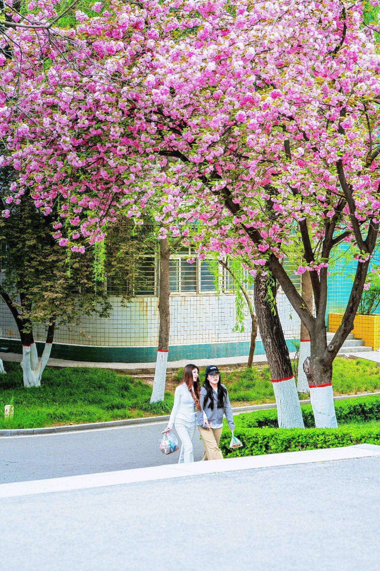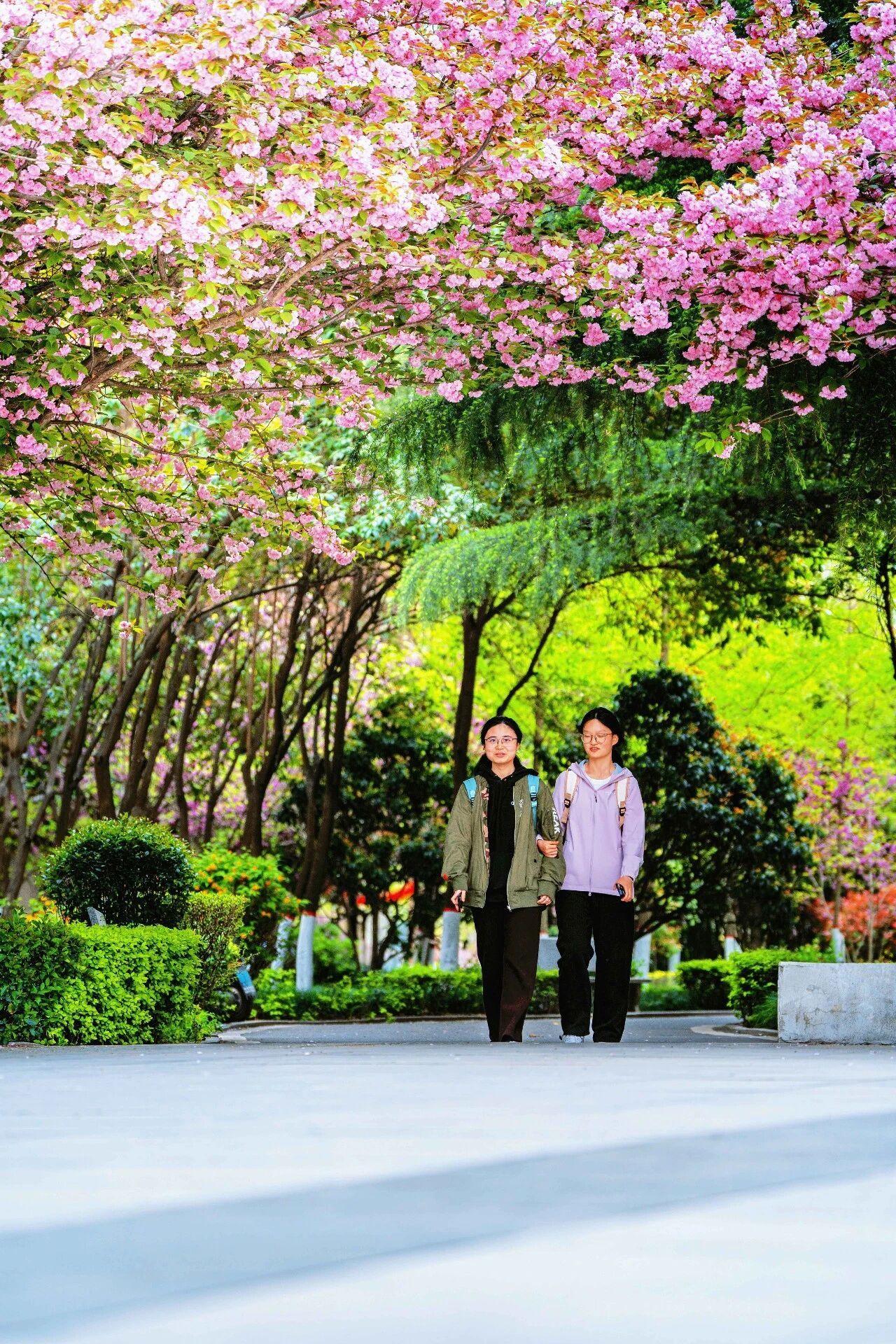 一树繁花,半日清闲。花瓣飘落,似蝴蝶振翅,曾映唐朝宫苑,今满培华校园。团团花瓣唱响青春的欢乐颂,簇簇粉红正是中华沃土上的最美春日诗。花映人面,人面如花,缀在花海,醉于春意。时光仿佛放慢了脚步,留人驻足观赏、打卡留念。