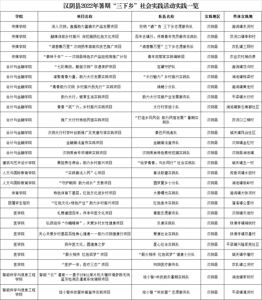 在汉阴专项实践团中,医学院青歌志愿服务队、乐康实践队、爱康社会实践队、星心社会实践队、“薪火相传 红色筑梦”健康小分队、向阳医疗服务队分别走进汉阳镇天池村、铁佛寺镇铜钱村和双喜村、平梁镇兴隆家苑社区、城关镇中堰村、双乳镇江河村等六个村镇开展医疗下乡活动。