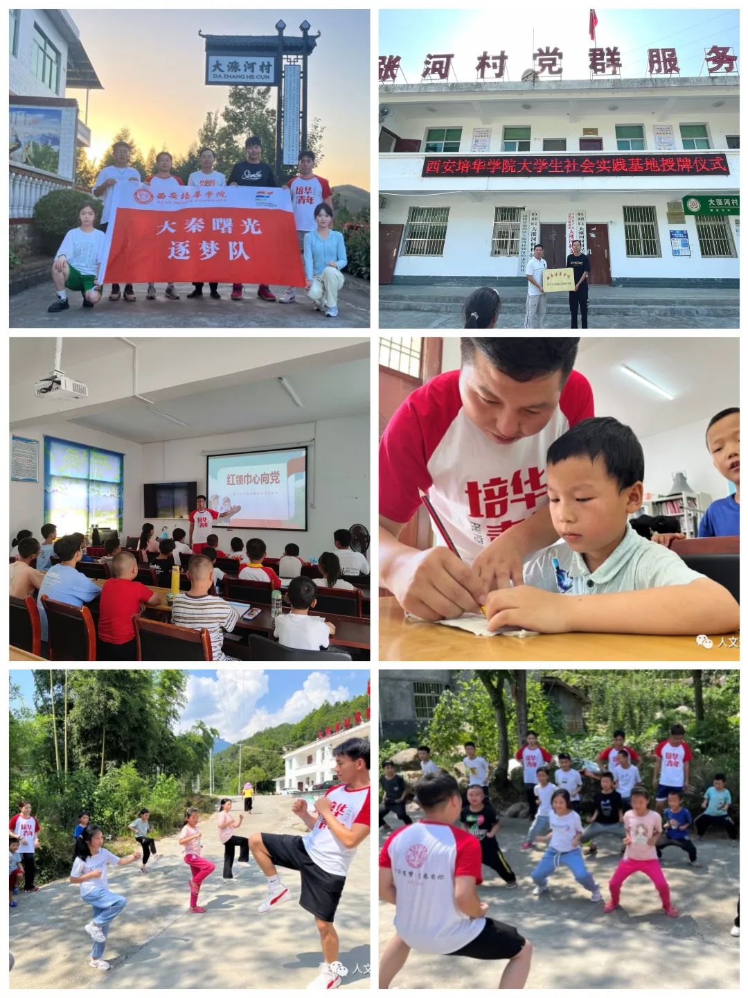 大秦曙光社会实践队前往漩涡镇大张河村开展特色体育教育社会实践活动。实践队员面向 30 个小朋友,先后开展了“阳光健美操”、“敬武跆拳道”和“激情篮球”的实践教学,在教学过程中融合“感恩教育”、“爱国教育”,将体育教育与课程思政教育相融合。