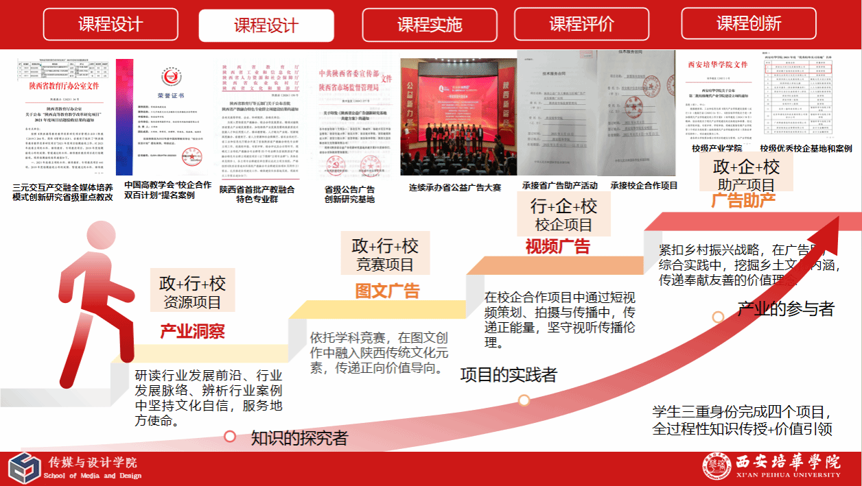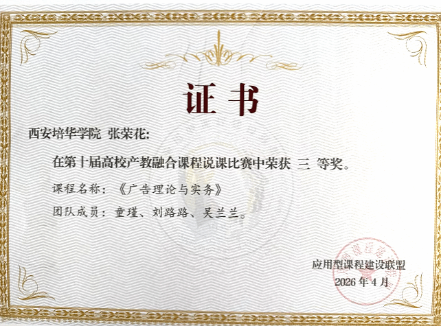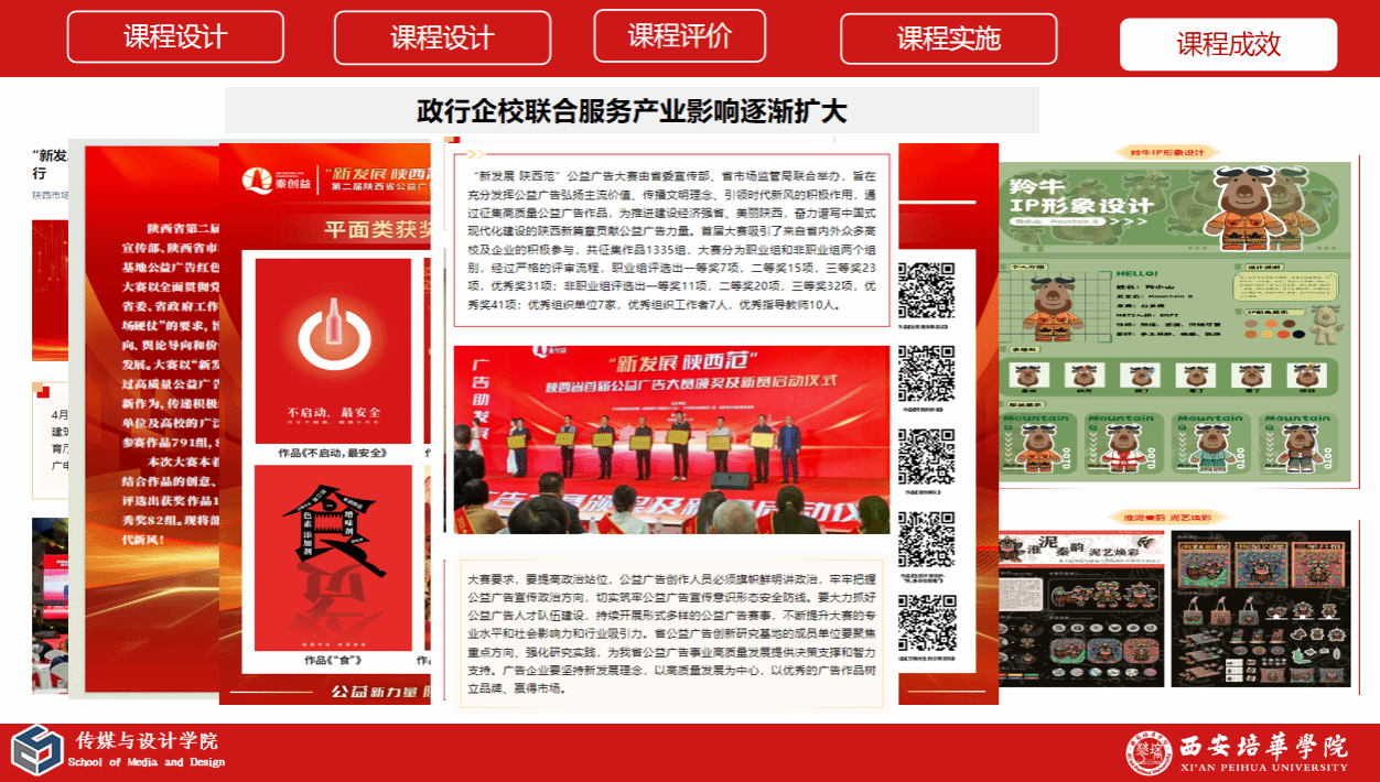 《广告理论与实务》课程作为培华第三批校企合作课程,是学校校级课程思政示范课、院级金课,该课程通过“三驱动四融入五协同”产教融合机制对课程教学目标、课程教学内容进行了重构,并将与陕西省市场监督管理局、陕西省广告协会、西安培华学院乡村振兴研究院及校企合作基地企业等系列“广告赋能产业”项目融入课堂,通过多元团队共指导、政校企平台共建、行企业资源共融、项目式进阶共生、多维育人共考量等进行实施,课程在师生能力、课程建设、产业影响和辐射价值等方面卓有成效,充分展现了学校在产教融合课程改革的成果,在比赛中获得评委充分肯定。