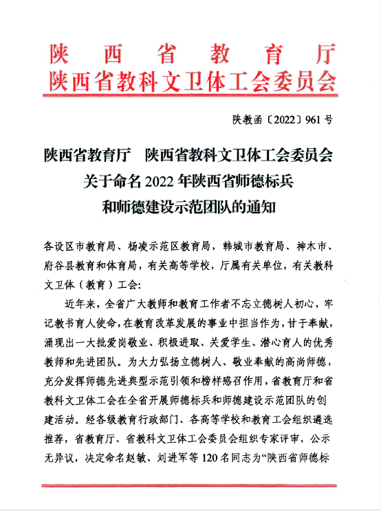 在第38个教师节来临之际,陕西省教育厅、陕西省教科文卫体工会委员会联合发布了《关于命名2022年陕西省师德标兵和师德建设示范团队的通知》,学校人文与国际教育学院常务副院长梁蕊副教授获“陕西省师德标兵”称号,学校医学院获“陕西省师德建设示范团队”称号。