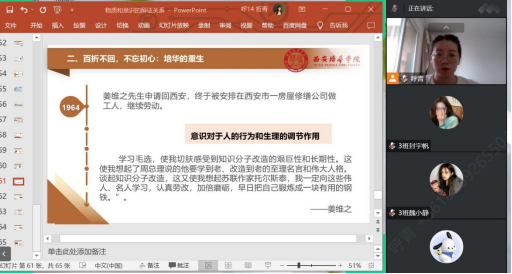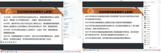 沈毓娜老师通过线上讨论的方式,结合校史知识讲授“否定之否定规律”。她带领学生们梳理学校历史,让学生了解办学历史的艰辛,理解培华的发展就是一个不断自我发展、自我完善的过程,是波浪式前进和螺旋式上升的,是曲折性和前进性的统一。在未来的人生道路中,每个人也应发扬培华人艰苦奋斗、不怕困难的精神。