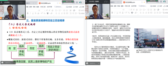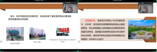 黄蓉老师以线上讨论的形式,在“量变质变规律”内容中融入培华校史。通过给学生讲述培华发展经历的四个阶段,和办学过程中面临的挫折和困难,帮助学生更好理解质量互变规律,增强学生的爱校荣校情怀。