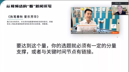 王庭元校友用充满激情的语言,通过聊天的方式,引用了大量生动的例子,从划不走、讲故事、说干货、持续升华、精神传承包容五个方面,就视频新闻如何采写这一话题,展开了内容,他表示为使视频新闻信息形成独特的风格,新闻编辑必须创新思路,寻找切口,注重细节,代入节奏,并增加自身对于新闻的素质和能力要求。他还说,“我们写出好新闻,做好宣传思想工作,就要牢牢把握主动权,主动出击,等新闻出现,不如出去找新闻。树立创新思维,心中要常有好思路,想别人想不到的。”