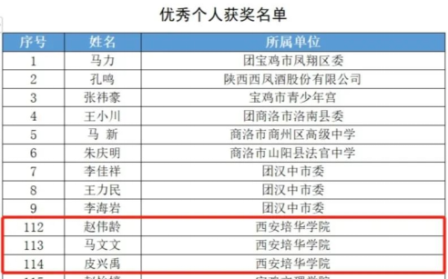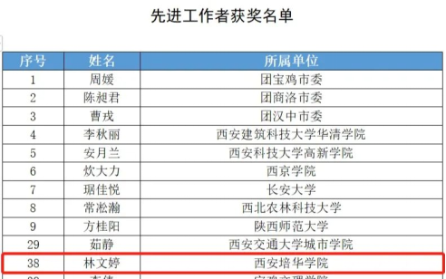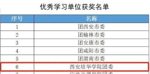 3月7日,共青团陕西省委办公室发布《关于2022年“青年大学习”网上主题团课学习情况评优结果的通报》,学校团委荣获“优秀学习单位”,校团委宣传部部长林文婷同志获评“先进工作者”称号、传媒学院赵伟龄同学、人文与国际教育学院马文文同学、建筑与艺术设计学院皮兴禹同学分别荣获“优秀个人”称号。