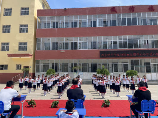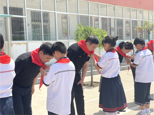 在煦日和风下,少先队员为出席捐赠仪式的嘉宾佩戴红领巾,并宣读感谢信,他们用诚挚的语言表达对学校的感激之情,表示将心怀感恩,以优异成绩回报社会。
