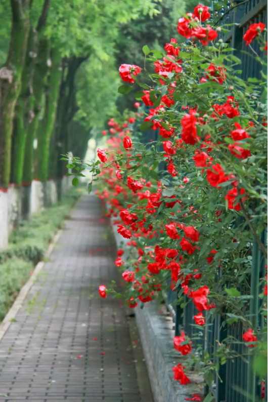 五月是蔷薇盛开的季节。阳光下,培华园里,花开得红似火,艳如霞。蔷薇形态各异,千姿百态。独一朵娇艳欲滴,开一片争妍斗艳。