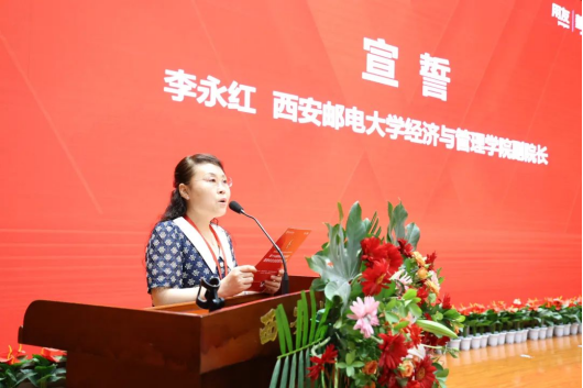西安邮电大学经济与管理学院副院长李永红教授和参赛学生郭香分别代表裁判组和参赛学生进行发言并宣誓,保证大赛的公平、公正、公开。