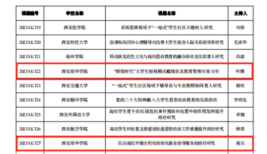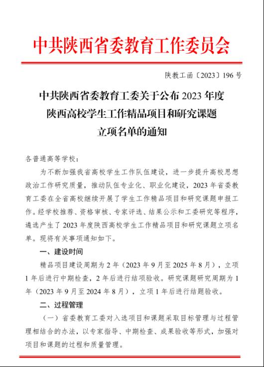 9月5日,中共陕西省委教育工委发布了《关于公布2023年度陕西高校学生工作精品项目和研究课题立项名单的通知》,学校党委学工部副部长权勇太主持的《以姜维之班创建提升立德树人育人成效的实践与探索》获精品项目立项;学生潜能发展中心叶腾老师主持的《“屏媒时代”大学生短视频成瘾现状及教育管理对策分析》获学生工作研究课题立项;人文与国际教育学院党委书记兼副院长南兵主持的《民办高校开展全程化精准化就业指导服务的路径研究》获学生工作研究课题立项。