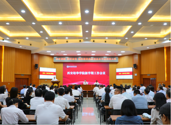 2023年9月8日下午,西安培华学院在明德楼报告厅召开2023年新学期工作会议。全体校领导、各二级学院院长(常务副院长)、副院长(院长助理)、党委书记(副书记)、系主任、专业带头人、办公室主任,各职能部门主任、副主任、主任助理,主管岗位以上人员等200余人参加本次会议。会议由党委书记罗新远主持。