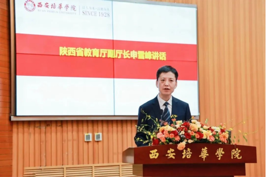 陕西省委教育工委委员、陕西省教育厅副厅长申雪峰代表陕西省委教育工委、陕西省教育厅向培华建校95周年表示热烈的祝贺。他指出,西安培华学院是陕西民办高等教育的典型代表之一,多年以来强化内涵建设,锐意开拓进取,在学校党的建设,办学机制改革,教育教学改革,办学条件改善,品牌专业建设等方面创造了许多经验。在我国民办高等教育发展迈入高质量发展新机遇的背景下,对陕西民办高等学校提出了三点希望:一是要全面贯彻党的教育方针,要牢牢抓住培养社会主义建设者和接班人的总体目标,坚守教育公益性,办人民满意的教育。二是持续提高教育教学质量,要落实教学工作在学校各项工作中的中心地位,加大教学投入,强化教学基本建设,在学科专业建设、教学成果培育、学生实习实训、校企合作育人等方面出实招、求实效,坚持质量立校、特色强校,在激烈的校际竞争中脱颖而出、勇立潮头。三是要注重民办高等教育理论和实践研究。进一步健全民办高等教育研究智库,加强理论研究与实践探索,总结民办高等教育发展的成果经验,发掘其中的理论和社会价值,既向国内外优秀的高校学习,也注重梳理总结本校改革发展中的经验教训,努力构建有中国特色的民办高等教育理论体系,引领民办高等教育高质量发展。