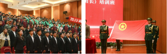 云梯青年学校校长、校团委书记杨媛为第十七期“青马工程”团支部书记(班长)培训班暨第十期高阶骨干培训班团建学长黄家驹授旗。