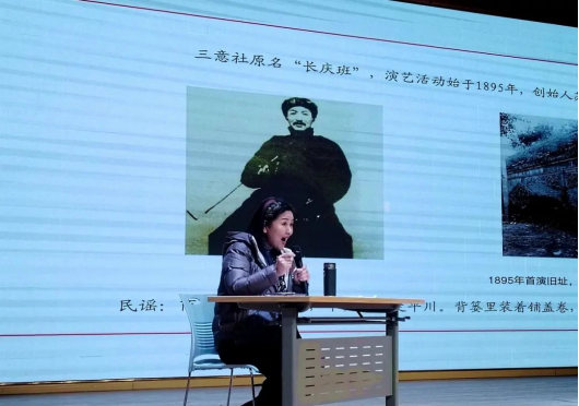 讲座开始,侯红琴老师用细腻婉转动听的戏曲唱腔为大家演唱了一首秦腔选段,并且用接地气的关中话为学生们深入浅出、形象生动的介绍了秦腔的起源、秦腔音乐、秦腔人物角色、秦腔脸谱、秦腔剧本等戏曲知识,及《轩门斩子》《铡美案》《下河东》《苏武牧羊》《金沙滩》《杨门女将》《陕北往事》等经典秦腔作品。