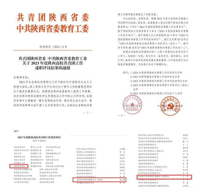 近日,共青团陕西省委、中共陕西省委教育工委联合下发《关于2023年度陕西高校共青团工作考核结果的通报》,西安培华学院获评“2023年度陕西高校共青团工作优秀单位”,校党委副书记、副校长姚文静获评“2023年度陕西高校支持共青团工作好书记(校长)”,校团委志愿服务工作部部长王朋获评“2023年度陕西高校共青团工作先进个人”。