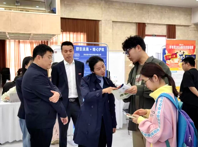 莲湖区人社局人才中心主任白博,学校党委副书记、副校长姚文静,校长助理鲍伟,招生与就业指导中心主任姚斌等亲临现场指导。人文与国际教育学院常务副院长梁蕊、党委书记南兵、教学副院长栾博强及学院2024届、2025届毕业生参加。招聘会现场,校领导与毕业生亲切交谈询问毕业生现阶段就业情况,鼓励毕业生端正心态、抓住时机,脚踏实地更早更好就业。