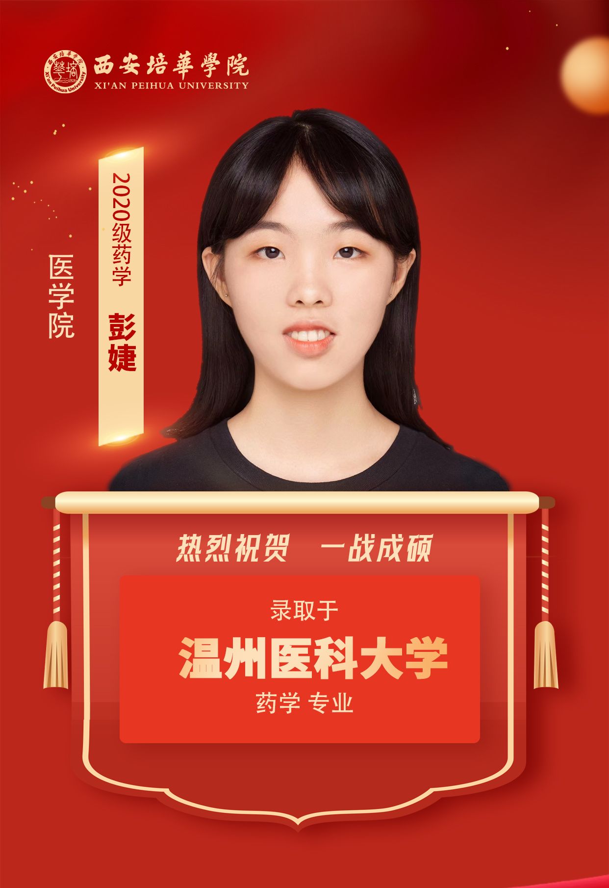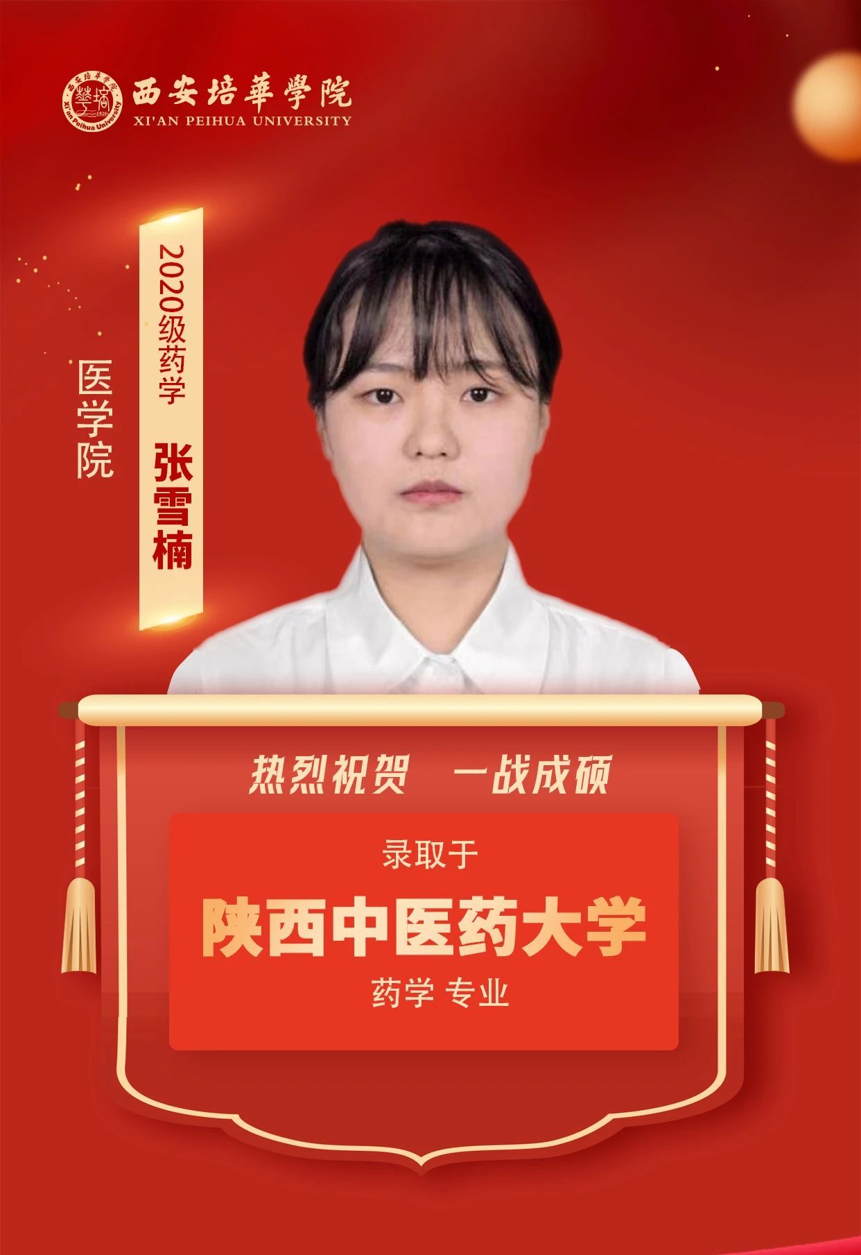 2020级药学专业张雪楠(考入陕西中医药大学):请抛弃完美主义的包袱,不必在每个细节上过于纠结。在备考后期,务必要进行模拟考试,并严格控制时间。衷心祝愿所有的学弟学妹们能够顺利通过考研,一战成硕,实现自己的梦想!