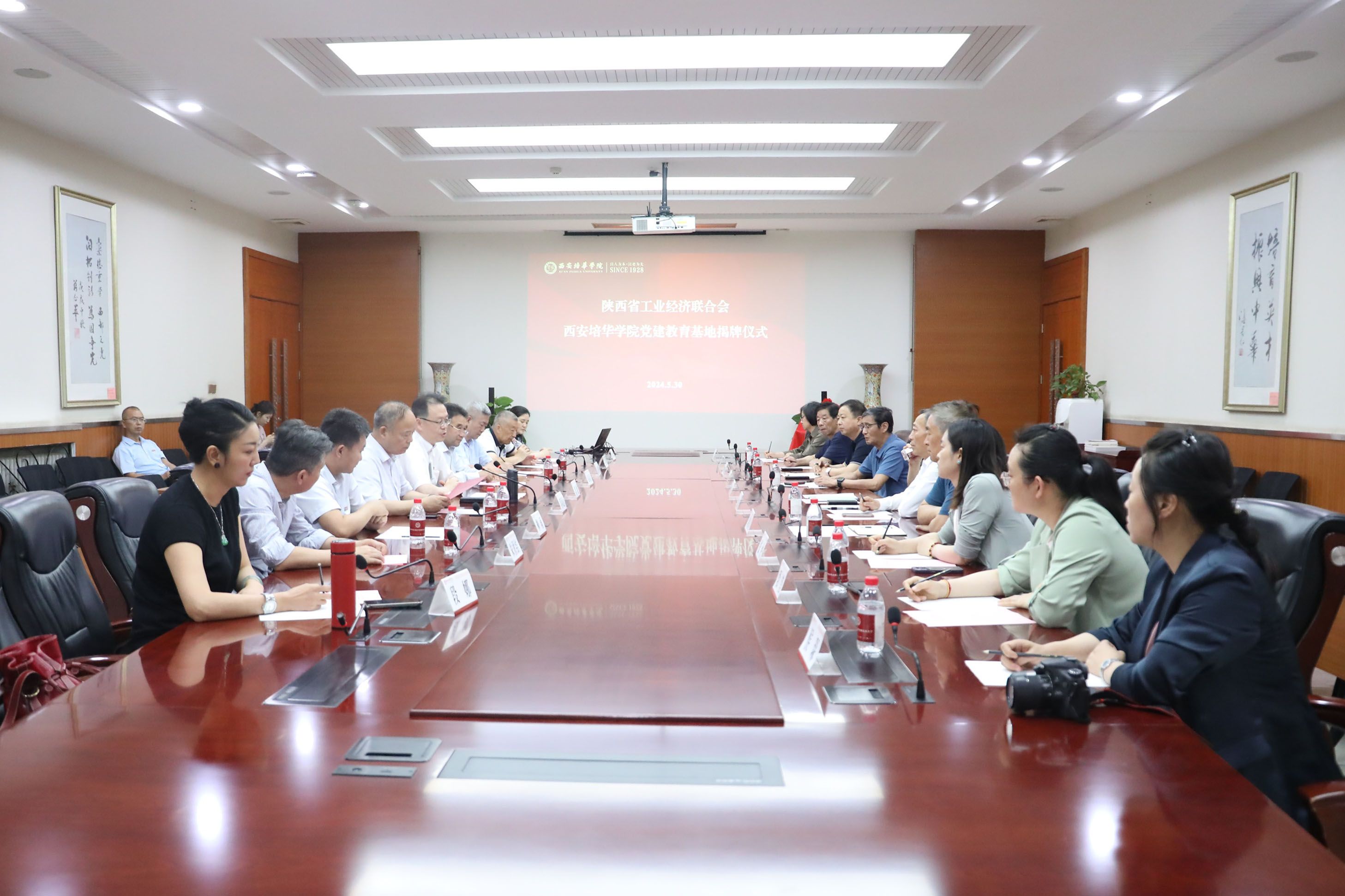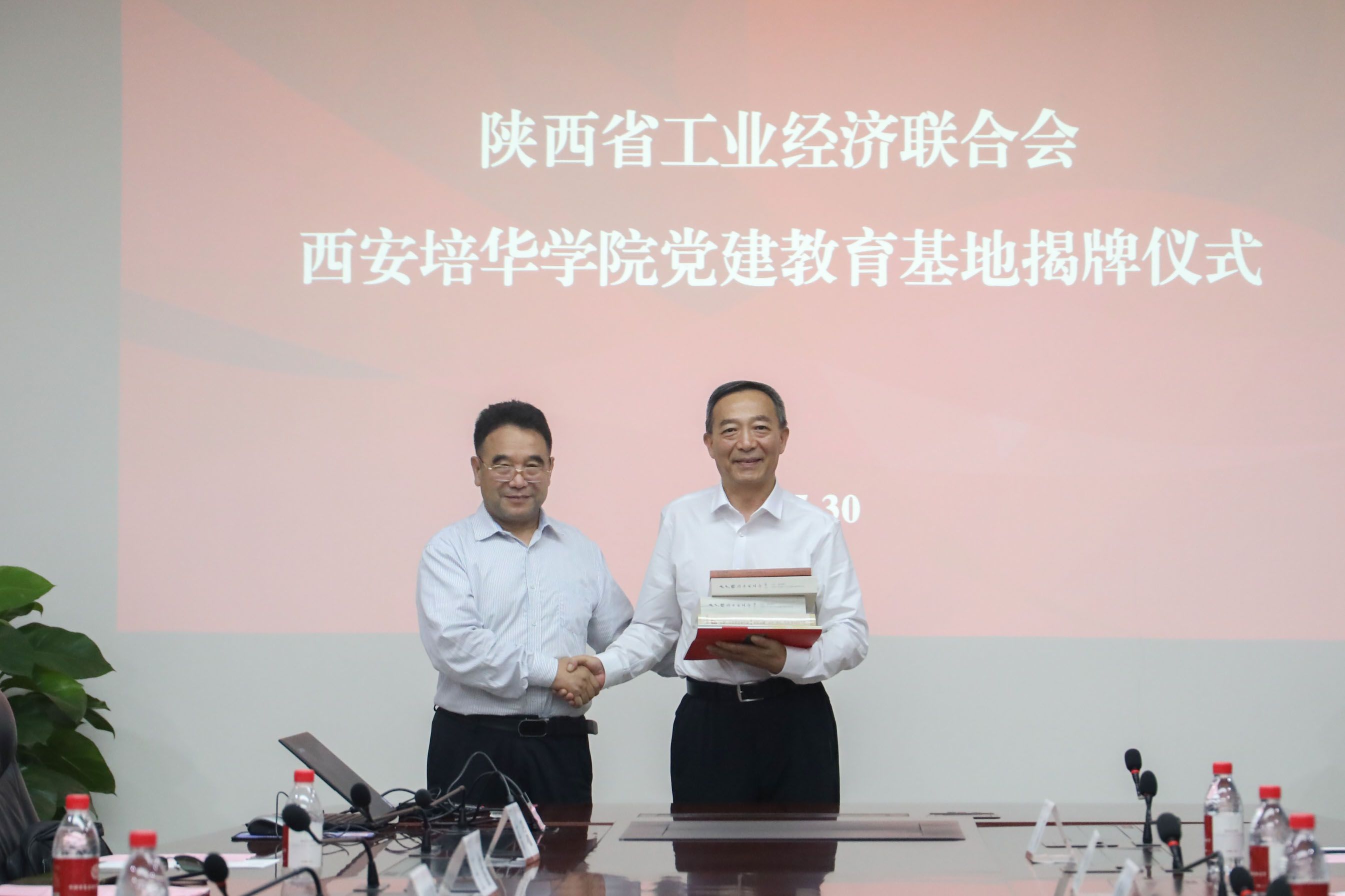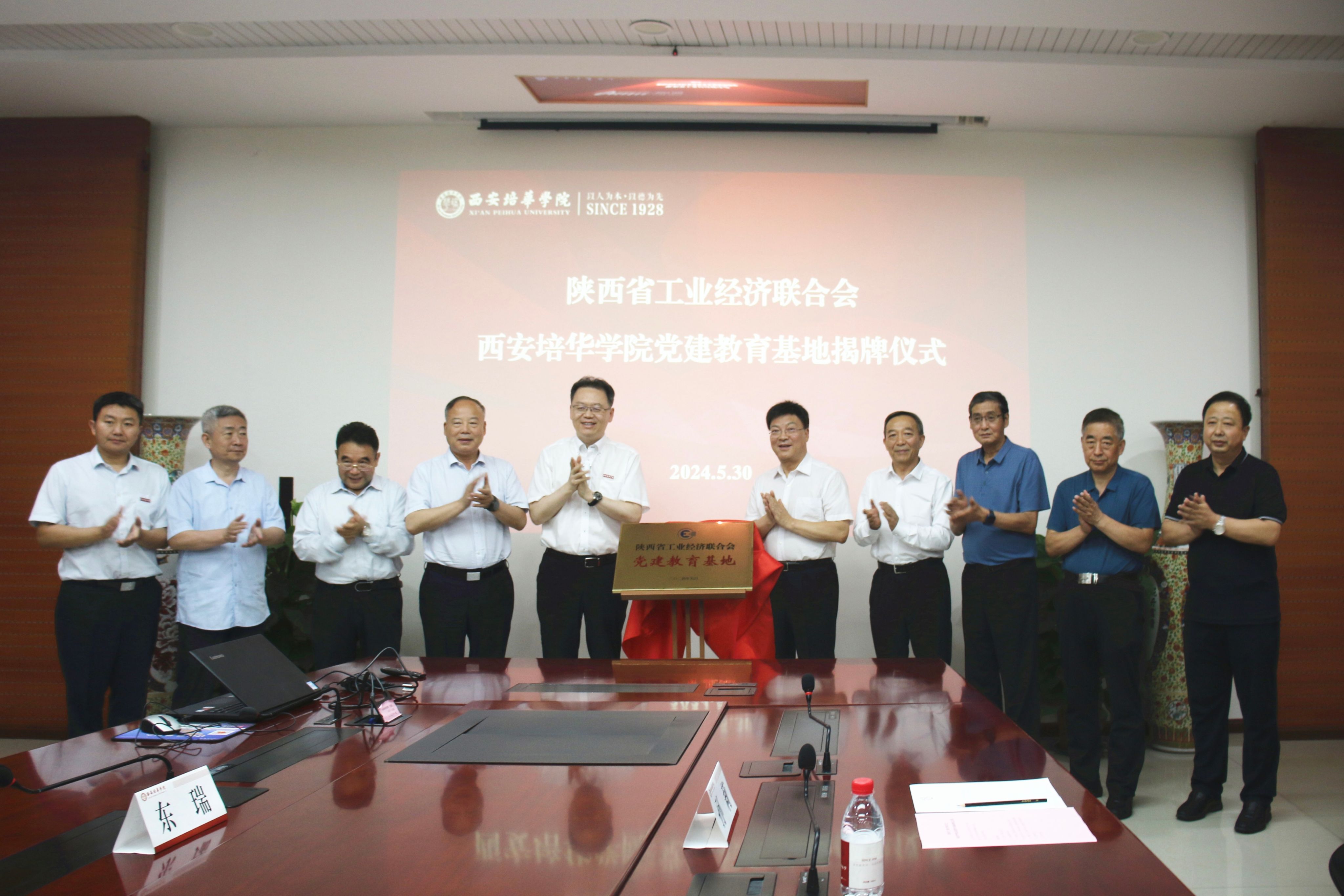 5月30日下午,陕西省工业经济联合会西安培华学院党建教育基地揭牌仪式于学校明德楼第一会议室举行。陕西省工业经济联合会会长孙安会,西安培华学院理事长、中国工业合作协会副理事长、陕西省工业合作协会理事长姜波出席仪式并共同为基地揭牌。工经联副会长兼秘书长、党支部书记法自领,陕工合副理事长、秘书长秦泉安等参加仪式。学校副校长、陕工合党支部书记罗新远主持仪式。