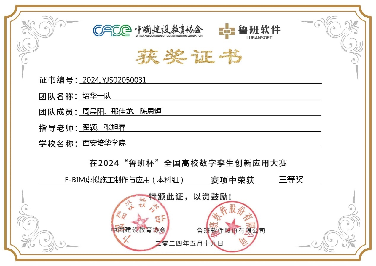 近日,中国建设教育协会举办的2024“鲁班杯”全国高校数字孪生创新应用大赛圆满落下帷幕。在此次赛事中,智能科学与工程学院邀请陕西建工第十一建设集团张旭春、中国建筑第七工程局王延博担任企业导师,师生高度重视,积极备赛,齐心协力、精诚合作,最终斩获国家级团体三等奖4项。段晓晓、翟颖、张旭春、王延博4名教师获得“优秀指导教师”的荣誉称号。