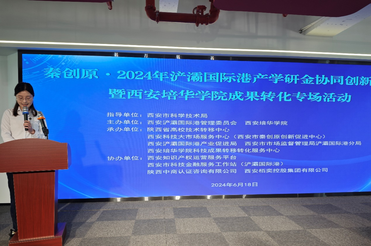 此次活动由西安市科技局指导,浐灞国际港管理委员会、西安培华学院主办。陕西省高校技术转移中心副主任田鹏,西安科技大市场服务中心、浐灞国际港产业促进局、市场监督管理局浐灞国际港分局相关负责人;西安知识产权运营服务平台、市科技金融服务工作站、陕西中商认证咨询有限公司、西安柏奕控股集团有限公司等辖区40余家科技企业代表参加活动。