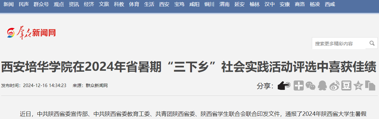 近日,中共陕西省委宣传部、中共陕西省委教育工委、共青团陕西省委、陕西省学生联合会联合印发文件,通报了2024年陕西省大学生暑假文化科技卫生“三下乡”社会实践活动结果,西安培华学院凭借卓越的组织能力荣获多项省级荣誉。